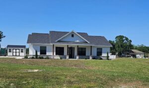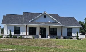 This charming modern farmhouse features 3 spacious bedrooms and 2 stylishly designed bathrooms. With an open-concept layout, the home boasts a bright and airy living area, a sleek kitchen with farmhouse-style finishes, and a cozy dining space perfect for family gatherings. The master suite offers a private retreat with his and her walk-in closets and an en-suite bath with a beautiful soaking tub.  Classic board and batten siding, stone and stucco exterior. A welcoming front porch, and cedar post add some rustic touches.