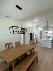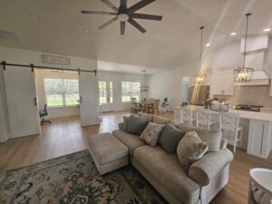 This charming modern farmhouse features 3 spacious bedrooms and 2 stylishly designed bathrooms. With an open-concept layout, the home boasts a bright and airy living area, a sleek kitchen with farmhouse-style finishes, and a cozy dining space perfect for family gatherings. The master suite offers a private retreat with his and her walk-in closets and an en-suite bath with a beautiful soaking tub.  Classic board and batten siding, stone and stucco exterior. A welcoming front porch, and cedar post add some rustic touches.